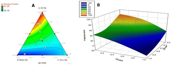 Contour plot (A) over the simplex space and response surface graph (B) representing nanoemulsion particle size (nm).