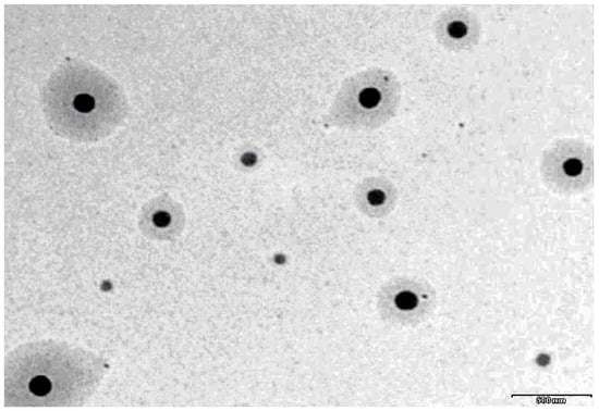 A representative TEM image of prepared moxifloxacin nanoemulsion (MM3) is shown in Figure 3. It is evident from Figure 3 that the prepared system has droplets in circular shape with uniform size and can be easily distinguished. The droplets appear darker with bright background and are randomly dispersed without any agglomeration throughout the field.