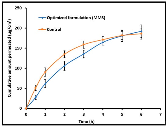 The diffusion of therapeutic molecules into and across the biological membrane is mainly influenced by the drug’s physicochemical properties, physiological characteristics of the membrane and different transport routes available for permeation [18]. Figure 5 compares the amount of moxifloxacin transported across the isolated rabbit cornea membrane from MM3 and control (commercial eye drops). A typical permeation profile was exhibited by both MM3 and control and the steady state flux values were comparable (MM3; 32.01 µg/cm2/h and control; 31.53 µg/cm2/h). The flux value observed here signifies that the physicochemical characteristics of MM3 are suitable for cornea permeation. The permeation rate was relatively high in the first hour with control as compared to MM3. This is probably due to the unique structure of moxifloxacin along with biphasic solubility (both lipophilic and aqueous solubility) and high lipophilicity which would have assisted its easy permeation through the corneal membrane [31].