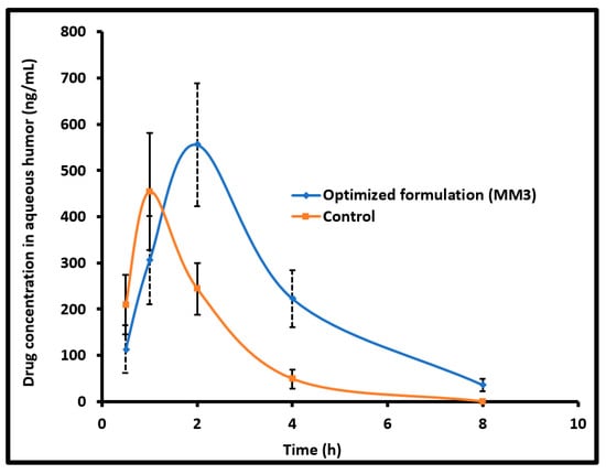 The concentration of the drug permeated into the aqueous humor after administration to the rabbit eyes was quantified to evaluate the ocular bioavailability of moxifloxacin from MM3 as well as the control. Different pharmacokinetic properties were analyzed by using a non-compartmental method [33]. The determined pharmacokinetic parameters are summarized in Table 5. Figure 6 compares the mean moxifloxacin concentration in the aqueous humor following topical installation of MM3 and control in rabbits. It is evident from Figure 6 that the kinetic profiles are distinct for MM3 and control. Indeed, moxifloxacin absorption was rapid and available in the aqueous humor after 30 min in MM3 (113.98 ± 51.45 ng/mL) and control (209.44 ± 64.53 ng/mL), however, the amount of drug was different. At 1 h, the drug level in the aqueous humor increased to 305.99 ± 94.95 ng/mL and 454.19 ± 126.91 ng/mL in MM3 and control, respectively. The drug absorption in MM3 was further prolonged and the drug level in the aqueous humor continued to rise to attain the peak drug concentration (Cmax; 555.73 ± 133.34 ng/mL) and the time corresponding to peak concentration (Tmax) was 2 h (which is 1 h in control). Comparing the drug absorption with the ex vivo permeation data, one can easily corroborate that the delay in absorption of moxifloxacin into the aqueous humor in MM3 is probably due to its slow permeation rate in the first hour observed in Figure 5. Followed by the rapid absorption, the drug level declined in both groups. At 4 h, the drug level in aqueous humor was considerably higher in MM3 (p < 0.0001) as compared to control. At 8 h, the drug level in aqueous humor for MM3 was 35.90 ± 13.01 ng/mL while no moxifloxacin was detected in the control. The mean value of area under the aqueous humor concentration versus time curve (AUC0–8 h) for MM3 (Table 5) was ~2 fold higher (p < 0.001), relative to the control, suggesting significant improvement in ocular bioavailability by MM3 in comparison to the control. The possible reason for the greater observed AUC could be due to the longer retention of vesicles (MM3) in the ocular surface which in turn prolongs the contact time of medicament with the eye and thereby improve corneal penetration, when compared to conventional eye drops, as described in the literature [34].