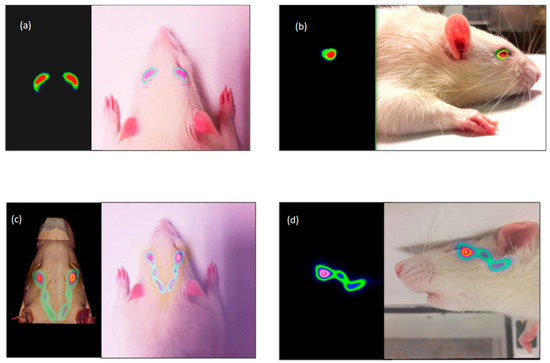 Fusion PET-CT-Real images of the rat’s head. Tacrolimus eye drops remain on the ocular surface after instillation (a,b) subsequently observed as it is eliminated by the nasolacrimal ducts (c,d). Axial (a) and sagittal (b) PET image and fusion PET-real images (10 min). Axial (c) fusion PET-CT image and Sagittal (d) fusion PET-real images (90 min post-administration). Reproduced with permission from [32], published by Elsevier, 2018.