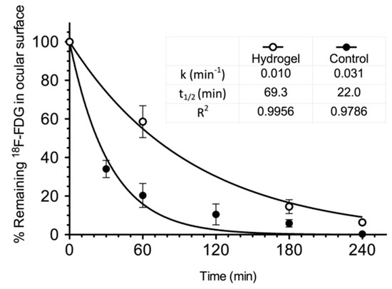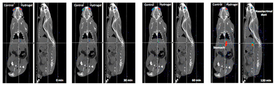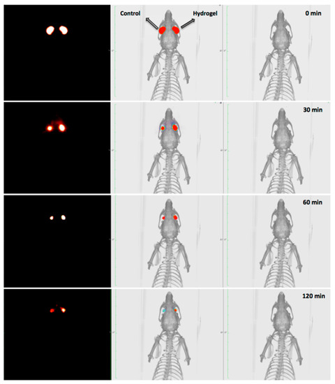 Through the PET technique, the behaviour of different types of polymers [33,34,35,36], such as chitosan labelled with 124I or its combined derivative with N-acetylcysteine (NAC-chitosan) was studied [34]. Another topical ophthalmic hydrogel formulation composed by gellan and kappa-carrageenan gum (0.82% weight/volume) labelled with 18F radiotracers was also assessed [33] (Figure 2 and Figure 3). In the aforementioned study, it was shown that it is possible to establish differences between the permanence on the ocular surface for different types of ophthalmic formulations by using different polymers as drug delivery vehicles; the technique proposed could be a safe method for this kind of future studies in humans. Some tacrolimus topical formulations for atopic keratoconjunctivitis [32], econazole-α-cyclodextrin formulated in hydrogel for the treatment of fungal keratitis [37], and cysteamine dispersed in different types of hydrogel for the treatment of cystinosis [38] have also been studied. Furthermore, the PET technique allows for the quantitative analysis of the formulations’ pharmacokinetic profile and the calculation of pharmacokinetic parameters, such as half-life and ophthalmic residence time [38].