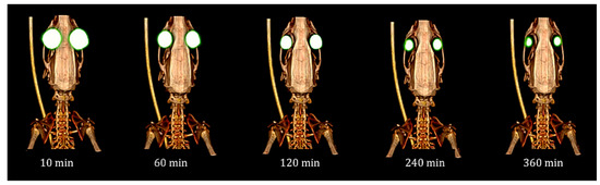Fused image PET/CT showing the signal evolution of intravitreal injections in the rat eyes throughout time. Reproduced from [39], which is licensed under a Creative Commons Attribution-NonCommercial-NoDerivatives 4.0 International License.