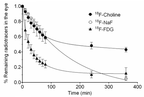 Intravitreal pharmacokinetic profile of 18F-FDG, 18FNaF, and 18F-Choline after intravitreal injection. Reproduced from [39], which is licensed under a Creative Commons Attribution-NonCommercial-NoDerivatives 4.0 International License.