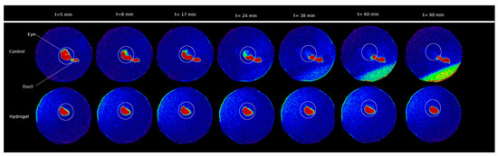 Scintigraphy image of a novel ion-sensitive hydrogel based on gellan gum and kappa-carrageenan. In the upper images (control eye), the signal decreases in the corneal surface, moving towards the nasolacrimal duct, while in the bottom images, signal obtained in the eye with hydrogel remains unchanged. Reproduced with permission from [51], published by Elsevier, 2017.