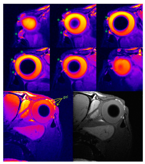 MRI has been used in preclinical studies to determine permanence on the ocular surface of ion-sensitive hydrogels based on gellan gum and kappa carrageenan to be employed as vehicles for ophthalmic drug delivery [110] (Figure 7). Through this study, Ferreiro et al. assessed the time of in vivo corneal contact and the hydrogel residence place after its administration, showing the absence of liquid solution 30 minutes after delivery, whereas in the case of the gellan gum formulation, it was still present three hours after delivery. The main improvement of this method is the absence of a contrast agent. In fact, the large quantity of water retained in the gel increases the intensity of the signal and, therefore, MRI seems to be a good and relevant method for assessing the precorneal retention time of the in situ gelation delivery systems.
