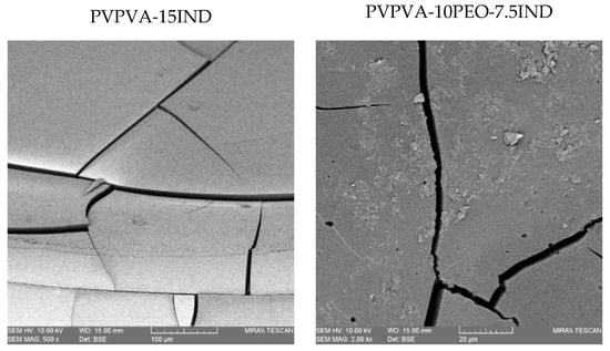 DSC analysis was performed on the tablets to investigate the physical state of the dispersions after the moulding process. The thermograms of the binary and ternary moulded dispersions are presented in Figure 4 and the values of the thermal transitions are detailed in Table 4. Both of the binary dispersions analysed showed to be amorphous as no endothermic peaks related to the melting of IND were detected (Tm = 164 ± 1 °C). A glass transition temperature of 95.8 ± 0.7 °C and 74 ± 1 °C for the doses with 15% and 30% of the drug were obtained confirming the known plasticising effect of the drug in the polymer. The thermograms of the ternary dispersions showed the melting peak of the crystalline fraction of PEO at temperatures between 65.9 and 62.5 °C. Also, the ternary systems exhibited one glass transition temperature that decreases with the content of IND. It is suspected that the system is composed of an amorphous miscible matrix composed of PVPVA-IND with dispersed crystalline PEO. These findings are in agreement with the SEM results that showed a crystalline phase dispersed in the amorphous matrix.