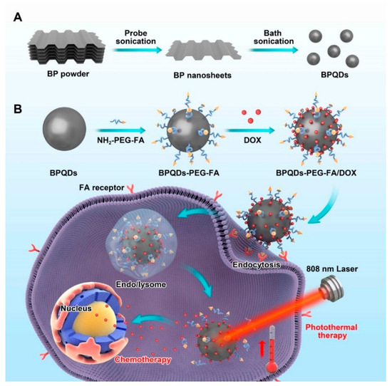 Herein, we designed a BPQDs-based drug delivery nanosystem for synergistic actively targeted chemo-photothermal therapy (Figure 1A) and applied this nanoplatform in cancer theranostics. BPQDs were obtained by a modified liquid exfoliation method (probe sonication followed by bath sonication of BP powder). Then, to endow BPQDs with active targeting functionality, folic acid (FA), a B vitamin with specific tumor-targeting properties [27,28,29], was conjugated on the surface of BPQDs by electrostatic interactions (Figure 1B) [30]. Subsequently, the folic acid-functionalized BPQDs were loaded with anticancer drugs (doxorubicin, DOX) for chemotherapy. As expected, this drug delivery system exhibited enhanced cancer cell killing ability, benefiting from the synergistic combination of chemo-photothermal therapy.