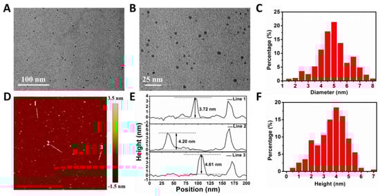 Transmission electron microscopy (TEM) images were taken on the FEI Tecnai G 2 F30 transmission electron microscope (FEI Company, Hillsborough, OR, USA) at an acceleration voltage of 300 kV. Atomic force microscopy (AFM) was performed on an atomic force microscope (Bruker Dimension® Icon™, Karlsruhe, Germany) to characterize the height of the samples. The zeta potential of nanoparticles (NPs) was determined by Malvern Mastersizer 2000 (Zetasizer Nano ZS90, Malvern Instruments Ltd., Malvern, UK). Fourier transform infrared spectra (FT-IR) of the samples were obtained with a Thermo Scientific Nicolet iS 50 spectrometer (Thermo Fisher Scientific Inc, Waltham, MA, USA) using the KBr method. X-ray photoelectron spectroscopy (XPS) was carried out using an X-ray photoelectron spectroscope (Axis HSi, Kratos Ltd., Mancheste, UK) with Al Kα radiation (1486.6 eV photons, 150 W) as the X-ray source for excitation. A high-resolution confocal Raman microscope (HORIBA LabRAM HR800, HORIBA Scientific, Paris, France) was employed to obtain Raman spectra. UV−vis-NIR absorption spectra were recorded by an Infinite M200 Pro TECAN GENIOS (Tecan Group, Männedorf, Switzerland).