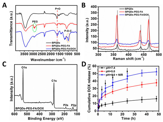 Figure 3A presents the FT-IR spectra of BPQDs, BPQDs-PEG-FA, and BPQDs-PEG-FA/DOX. The peak at ~1630 cm−1 for all samples was ascribed to the P=O stretching mode [31,32]. The absorption bands centered at ~2900 cm−1 of BPQDs-PEG-FA could be assigned to the successful conjugation of PEG-FA [30]. After DOX loading onto the BPQDs, several new peaks appeared. The absorbance peak at ~1000 cm−1 was due to the formation of P–O–C bonds [32], indicating that DOX molecules were chemically bound with BPQDs through P–O–C bonds. The NPs were also characterized by Raman spectroscopy (Figure 3B). BPQDs exhibited three prominent peaks, which were ascribed to one out-of-plane phonon mode at 361.6 cm−1 () and two in-plane modes at 438.7 () and 467.3 cm−1 () [33,34]. After the PEG-FA modification and DOX loading, blue-shifts were observed, which might be due to the slightly increased height of the BPQDs. The nanoparticles were further characterized by X-ray photoelectron spectroscopy (XPS). Compared with BPQDs and BPQDs-PEG-FA (Figure S4), the peak intensity of P in BPQDs-PEG-FA/DOX was much weaker (Figure 3C), indicating that a thin layer of molecules (DOX) was coated onto the surface of BPQDs-PEG-FA. Furthermore, the strong intensity of C in BPQDs was due to the surface adsorption of C which was used for calibration.