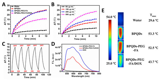 The NIR photothermal performances of the BPQDs-based NPs were investigated, and the results are displayed in Figure 4 and Figure S7. As displayed in Figure 4A,E, the temperature of the BPQDs, BPQDs-PEG-FA, and BPQDs-PEG-FA/DOX solution increased by 25.4, 24.7 and 15.8 °C, respectively (1 W cm−2, 10 min, 200 μg BP mL−1), which was much higher than that of water (ΔT ≈ 3.6 °C). As shown in Figure 4B and Figure S7, a concentration- and power intensity-dependent photothermal effect of BPQDs-PEG-FA/DOX was observed. A similar photothermal heating effect of BPQDs could also be found (Figure S8). Furthermore, the photothermal stability of BPQDs-PEG-FA/DOX was evaluated (Figure 4C). During the process of continuous laser irradiation for 5 cycles, no significant temperature change was observed, suggesting the excellent photothermal stability of BPQDs-PEG-FA/DOX. Moreover, we performed a fluorescence quenching experiment (Figure 4D). The fluorescence intensity of loaded drug molecules could be partially quenched by folic acid-modified BPQDs, indicating the strong interaction between DOX molecules and BPQDsPEG-FA [37].