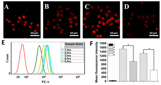 Confocal images of HeLa cells incubated with (A) free DOX, (B) BPQDs-PEG/DOX, (C) BPQDs-PEG-FA/DOX and (D) BPQDs-PEG-FA/DOX + free folic acid after incubation for 2 h. (E) Flow cytometry (FCM) histogram profiles of cellular DOX fluorescence intensities in HeLa cells after 1 h incubation. (F) Quantification analysis of DOX fluorescence intensity in HeLa cells after incubation for 1 h. 1, 2, 3, 4, and 5 represent control, DOX, BPQDs-PEG/DOX, BPQDs-PEG-FA/DOX, and BPQDs-PEG-FA/DOX + free folic acid, respectively. (* p < 0.05).