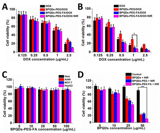 Relative viability of HeLa cells after treatment with DOX and different NPs for (A) 24 h and (B) 48 h. (C) Cell viability of HeLa, A549, MCF-7, and HepG2 cells with various concentrations of BPQDs-PEG-FA. (D) Relative cell viability of HeLa cells incubated with various concentrations of BPQDs-based NPs with NIR laser irradiation (808 nm, 1 W cm−2, 10 min). (* p < 0.05, ** p < 0.01).