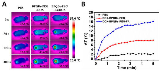 Inspired by the exciting results in vitro, we further demonstrated the photothermal activity of the BPQDs-based drug delivery system in vivo. The results are shown in Figure 7A,B. For the BPQDS-PEG and BPQDS-PEG-FA treated groups, the temperature of the tumor sites in mice increased to 44.9 and 52.5 °C, respectively, within 5 min under the NIR irradiation, while the temperature of the tumor treated with PBS only increased to 38.2 °C. These results demonstrated the high efficiency of BPQDS-PEG-FA as a PTT agent and its excellent tumor targeting ability for in vivo tumor ablation.