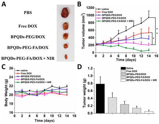 In vivo studies were conducted to further evaluate the enhanced therapeutic effect of the chemo-photothermal combination therapy of BPQDS-PEG-FA/DOX (Figure 8). All four treatment groups (DOX, BPQDS-PEG/DOX, BPQDS-PEG-FA/DOX, and BPQDS-PEG-FA/DOX + NIR) showed active therapeutic effects, while the tumors of the control group were growing at a noticeable rate. As shown in Figure 8B, BPQDS-PEG/DOX could inhibit tumor growth to a certain extent, possibly due to longer retention of BPQDS-PEG/DOX in comparison with free DOX [38]. BPQDS-PEG-FA/DOX displayed a better tumor inhibition effect than BPQDS-PEG/DOX, which was attributed to the active tumor targeting effect of folic acid ligand, resulting in more accumulation of DOX. Remarkably, the tumor growth in mice treated with BPQDS-PEG-FA/DOX with NIR laser irradiation resulted in the best remission. Such an excellent antitumor ability could be ascribed to an enhanced specific delivery and outstanding synergistic effect of the combined chemo-photothermal therapy. Figure 8C shows the body weight curves of the treated mice throughout the whole treatment process.