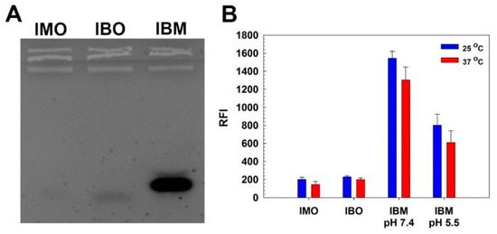 Prior to conjugation of ODNs to HA, hybridization and denaturation behavior of IMO and IBO were investigated by EtBr binding assay. EtBr is known to bind single stranded ODN showing sufficient fluorescence to detect and its fluorescence is significantly increased with binding to double stranded DNA [16]. First, agarose gel electrophoresis was performed to confirm the hybridization of IMO and IBO. In Figure 1A, although IMO and IBO only displayed faint bands on the gel, IBO-IMO hybrid (IBM) showed a strong band, meaning that IMO and IBO can be hybridized via complementary base paring. Less migration of the IBM band than those of IMO and IBO bands also demonstrated the size increase of IBM via hybridization. Hybridization and denaturation of IMO and IBO were further examined by measuring EtBr fluorescence change (Figure 1B). IMO and IBO showed low fluorescence values (~200 relative fluorescence intensity, RFI) due to the binding of EtBr to single stranded ODNs. Abrupt increase of fluorescence from IBM at pH 7.4 was observed, meaning the hybridization of IBO and IMO. At pH 5.5, the fluorescence of IBM was decreased to about 50% value of IBM fluorescence at pH 7.4. This result showed that hybrid structure of IBO and IMO could be denaturated in acidic condition probably due to the formation of i-motif structure of IMO and the following dissociation from IBO. It is also noteworthy that elevated temperature (37 °C) slightly diminished the EtBr fluorescence intensity from hybrids with low melting temperature (44.1 °C provided by the manufacturer) due to the partial denaturation.