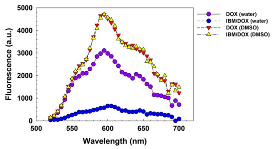 Fluorescence measurement of doxorubicin (DOX) and IBM/DOX in water and dimethyl sulfoxide (DMSO).