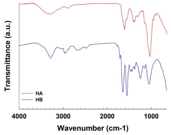 FT-IR spectra of HA and HA-IBO conjugate (HB).