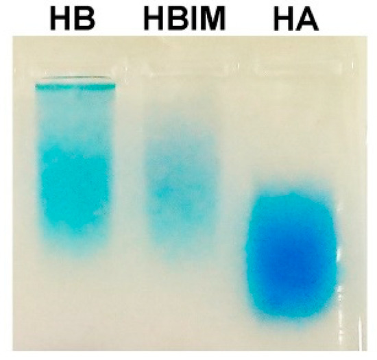 Agarose gel electrophoresis followed by Stains-All staining was also performed to confirm the conjugation of IBO to HA. Stains-All is known to bind to anionic molecules such as HA and nucleic acids [23,24]. Figure 4 displayed distinct band from HB, hybrid of HB and IMO (HBIM), and HA. HA band was broad, meaning its broad molecular weight distribution. Less migration of HB than HA suggested the increase of molecular size by conjugation of IBO to HA. HBIM band was located at a similar position to HB band even after hybridization of IMO, showing the balance between band retardation by increase of molecular size and band migration by additional negative charges.