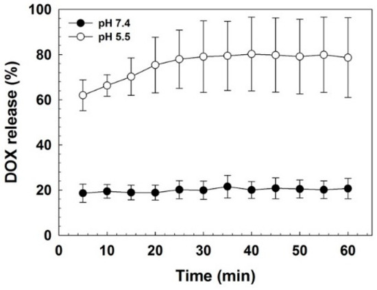 Then, release behavior of DOX in HBIM/DOX was investigated. It was observed by monitoring the change of released DOX fluorescence intensity from HBIM/DOX (Figure 5). At pH 7.4, the amount of released DOX from HBIM/DOX was maintained as about 20% through the measurement period, showing the stability at pH 7.4. However, significant DOX release (about 60%) was observed at pH 5.5 even after 5 min of incubation and it was gradually increased to about 80% (from 30 min incubation). This result means that in acidic conditions, loaded DOX molecules in HBIM structure could be released in pH-responsive way due to the prompt disruption of HBIM hybrid structure by dissociation of IMO via i-motif formation.