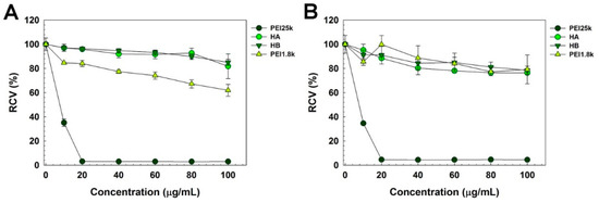 Cytotoxicity of polymers was evaluated by MTT assay (Figure 6) in HeLa and A549 cells. In both cells, PEI25k-treated cells showed significant decrease of viability, referring to its high cytotoxicity. However, viability of HA- and HB-treated cells was more than 80% even at high concentration of 100 μg/mL, demonstrating their negligible cytotoxicity. PEI1.8k-treated cells also showed relatively high cell viability. At low concentrations where HBIM/PEI complex was formed (<5 μg/mL), the cell viability was above 90%.