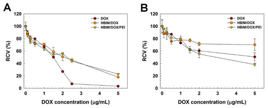 Anticancer activity of HBIM/DOX and HBIM/DOX/PEI in (A) HeLa cells and (B) A549 cells.