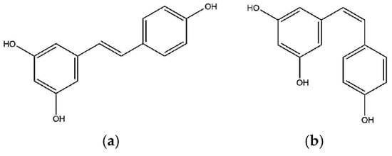 Structure of (a) trans-resveratrol (3,5,4′-trihydroxystilbene) and (b) cis-resveratrol.