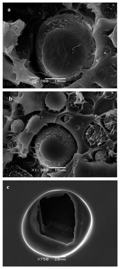 Representative SEM micrographs of cross-section RSV-loaded microcapsules prepared with different concentrations of poly-ε-caprolactone: (a) 2.91% PCL; (b) 1.5% PCL; (c) 0.08% PCL.