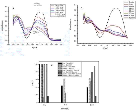 UV-visible spectra of isomerization and degradation of RSV under UV light exposure in (a) ethanol and (b) PBS (50 mM), pH 7.4. (c) Photodegradation study in solid: Percentage of the decay of trans-RSV, free and encapsulated, in microcapsules after UV light exposure (254 nm).