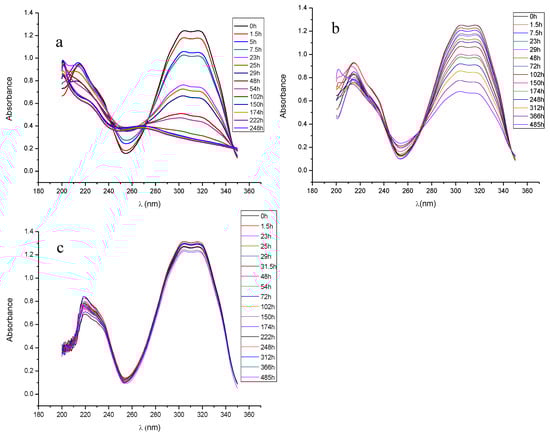 The isomerization and degradation of trans-RSV to the cis-form of a UV-irradiated solution of trans-RSV in ethanol and PBS, respectively, is displayed in Figure 5a,b. Secondary absorbance maxima were observed for both isomer forms. Concisely, in ethanol, the percentage of each isomeric form was 50% after 4 h of exposure. Regarding the stability of RSV in aqueous solution under dark conditions, the trans-RSV degradation is clearly affected by the pH level of the solution (Figure 6). For comparison, results indicated that trans-RSV has a rapid isomerization in PBS (pH 7.4) when the samples were exposed to UV light, in contrast to the same concentration of samples that were protected from light (Figure 6a). Furthermore, the lineal fit of RSV isomerization from trans- to cis- form followed first order kinetics (y = −0.0856X + 1.013; r2 = 0.9975), as confirmed by the comparison between the RSV concentration in function of the UV exposure time. As can be observed, upon UV irradiation, a degradation product of RSV appeared at 260 nm (Figure 5a), indicating a photodecomposition process of the RSV molecule. In consonance with other authors, RSV was found to be stable for much longer times at lower pH buffers (6.4 and 5) and under dark conditions [,] (Figure 6b,c). In fact, the stability of RSV solutions at pH 5 was kept for at least 312 h. A very complete study of the kinetics of RSV degradation in aqueous solutions, as a function of temperature and pH level, has been already published [].