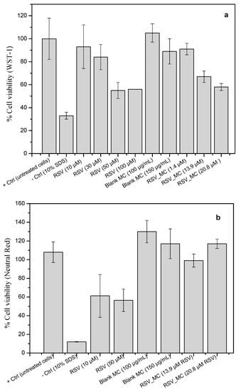 The microcapsule cytocompatibility was evaluated by two standard methods, the WST-1 assay and a neutral red uptake test. For WST-1 assay, cells were seeded in 96-well plates at a density of 15,000 cells/well in DMEM supplemented with 10% FBS and left overnight for attachment. Cells were co-incubated with 4 different RSV concentrations, with blank and RSV-loaded microcapsules (10 and 15 µg per well). Triplicate cultures were maintained for 24 h for each treatment. Cells proliferation was determined using the WST-1 reagent (Roche Applied Bioscience, Madrid, Spain), according to the manufacturer’s protocol.