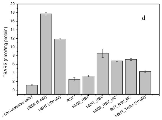 A lipid peroxidation assay performed in macrophages revealed a large content of TBARS in H2O2 and t-BHT–exposed cells (Figure 9d). Incubation with 10 µM of RSV significantly decreased TBARS, suggesting that lipid peroxidation was decreased by RSV treatment. The exposure of cells to RSV-loaded MC (with the same amount of RSV than those used for free RSV experiments) also showed a significant decrease of TBARS levels, although they were higher when compared to RSV or Trolox (a potent antioxidant molecule). The uncontrolled oxidative stress in cells causes direct damage to lipids. The high levels of free radicals or reactive oxygen species (ROS) are produced by the mitochondria, plasma membrane, endoplasmic reticulum, or peroxisomes, upon exposure to different stress conditions or exogenous stimuli, such as infections, toxins, pharmaceutical substances, or formulations. Therefore, free and loaded-RSV seemed to play a role as an inhibitor of lipid peroxidation in cells, at our experimental conditions. However, it must be noted that MDA levels were determined by a TBARS assay, which is known to be strongly affected by the reaction conditions used between laboratories. Therefore, direct comparison to the data provided by the different researchers is often complicated. Even so, these results are in consonance with the inhibition of lipid peroxidation by RSV founded in vivo, explained by various mechanisms [], and also in cell cultures [,].