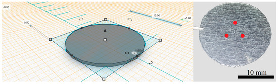 TinkerCad desing of the 3D printed nail (left) and image of 3D printed nail printout: red dots signify the approximate locations that were scanned using confocal Raman spectroscopy (right).
