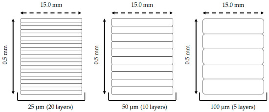 Illustration of the different number of layers present per scaffold using (left to right) 25, 50 and 100 μm printing resolutions.