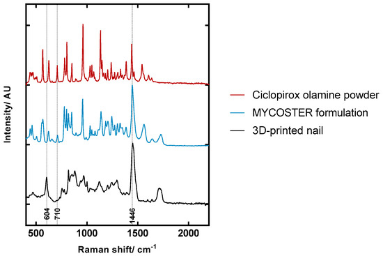 Representative spectra of ciclopirox olamine, the commercial formulation and the 3D printed polymeric matrix, are shown in Figure 3 with key Raman bands identified. Spectra were scaled and offset for clarity. The 604 cm−1 band was only identified in the 3D printed polymeric construct. This peak was used to confirm the position of the surface of the 3D printed nail and was also used as a point to align depth profiles. The 710 cm−1 band was present for both ciclopirox olamine and the commercial formulation. Understandably, there are many common peaks between the commercial formulation and ciclopirox olamine, and by comparing the two spectra, it is evident that the 710 cm−1 peak is only produced by ciclopirox olamine and not by the formulation excipients. This peak is sharper in the ciclopirox olamine powder spectrum than it is in the commercial formulation because the drug in the formulation is in solution and not that of a pure substance. Raman spectra of crystalline substances are more intense when compared to those obtained in solutions. The 710 cm−1 band was selected to detect the penetration of ciclopirox since it did not interfere with any bands produced from the 3D printed nail spectra. Peak areas of this band were normalised to the 1446 cm−1 band that is attributed to CH bending [21]. The 1446 cm−1 is relatively large in both the 3D printed polymeric matrix and the commercial formulation. Excipients in the formulation, such as isopropyl alcohol, ethyl acetate and the methylvinyl ether-maleic acid monobutylester copolymer all contribute to this spectral feature. This peak is broader in the 3D printed polymeric matrix and there is a distinct lack of sharp peaks is the spectrum, suggesting that the polymer chains matrix have a random arrangement.