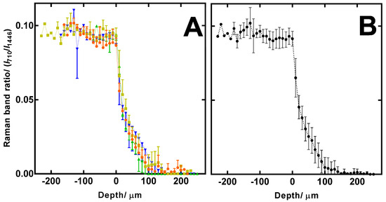 As shown in Figure 4, ciclopirox content was detected in the residual dried formulation film. CRS measurements also confirmed the mean residual lacquer film thickness as 112.5 ± 45.6 μm. The first frame measured inside the 3D printed nail was taken at 0 μm (Figure 4) and subsequently, deeper measurements were expressed with positive depth values. Depth profiles between replicates were consistent as shown in Figure 4A,B.