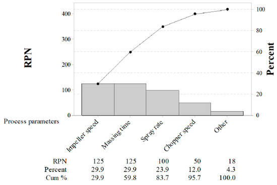 As shown in Table 2, FMEA was performed to identify the effects of CPPs on CQAs and IQAs. Previous experience with these process steps and information about the control tablet from the published literature [8,9,14,19,40,41,48] or prior analysis were used to determine the degree of risk associated with process parameters and its potential to impact the CQAs and IQAs. For the risk assessment, three categories (high, medium, and low) were mapped based on the degree of RPN. Moreover, a pareto chart was constructed with RPN as shown in Figure 1. The RPN and the cumulative total number were presented in descending order by the bars and line, respectively. The RPN of agitator speed, massing time, and binding suspension addition rate were 125, 125, and 100, respectively. Moreover, the cumulative percent of the three process parameters was 83.7%. Based on the risk assessment, the agitator speed, binding suspension addition rate, and massing time were identified as potentially having a risk impact on CQAs and IQAs and these were evaluated in detail with experimental design.
