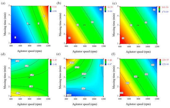 The equation shows that agitator speed (p1), binding suspension addition rate (p3), massing time (p2), the mutual interactions between them were the significant factors affecting granule bulk density. The effect of binding suspension addition rate and massing time on the granule bulk density is presented in Figure 2e as a contour plot. The granule bulk density increased with increasing binding suspension addition rate and massing time (positive effect). These two parameters also exhibited a strong positive interaction. Meanwhile, the mutual interaction between agitator speed and massing time had a negative effect on the granule bulk density.