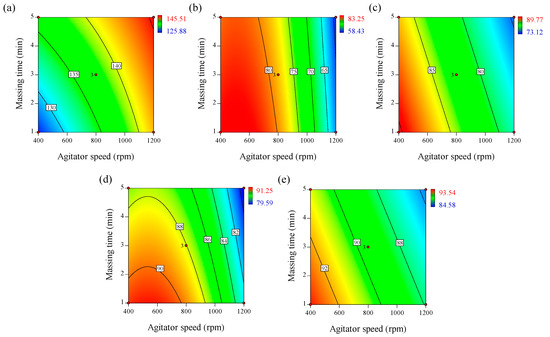 A response surface design was used to evaluate the effect of the three control factors on the three response factors. Table 3 presents the experimental matrix for the 15 experiments and experiment results. The mathematical empirical models were generated with coded values for factor levels. A positive coefficient indicated a synergistic effect on the response factor, whereas an antagonistic effect on the response factor was a negative coefficient. In addition, a larger coefficient indicated a stronger effect of the independent variable of the response [49,50,51].