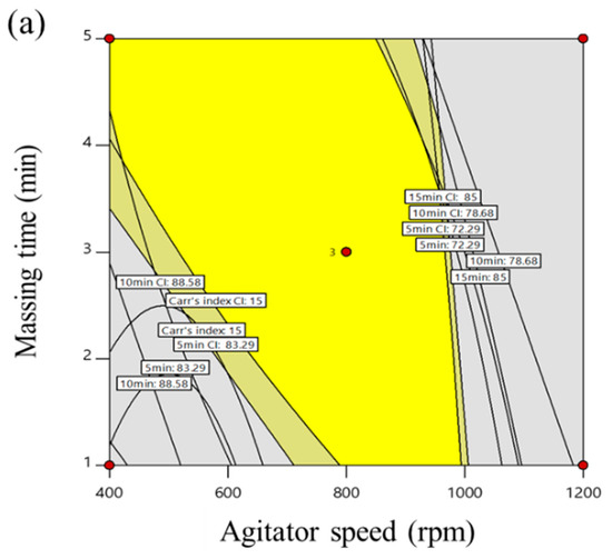 Agitator speed (p1) and massing time (p2) had significantly negative effects on granule flowability. The effect of agitator speed and massing time on Carr’s index of the granules is presented in the contour plot in Figure 2b. An increase in agitator speed and massing time could generate high shearing forces between the particles. Consequently, the growth and densification of the granules would progress. Therefore, Carr’s index decreases with increased agitator speed and massing time.