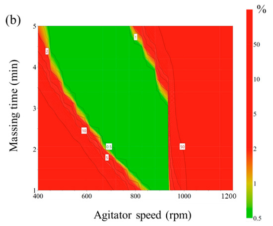 All of the factors had significant effects on granule hardness (p < 0.05). Agitator speed (p1) and massing time (p2) had positive effects, whereas binding suspension addition rate (p3) had a negative effect on granule hardness. This is presented in the contour plot in Figure 2a. The plot shows that higher agitator speeds and longer wet massing times increased granule hardness; granule hardness was also increased at low water addition rates. Higher agitator speeds and longer massing times could increase granule density and hardness because high shearing forces consistently exist between the particles [8,13,14,52]. Thereore, the bonding strength between particles strengthens the resistance to the separating forces.