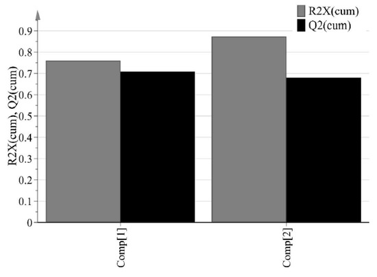 Cumulative R2 (R2X(cum)) and Q2 (Q2(cum)) of response factors (IQAs and CQAs) for two principal components.