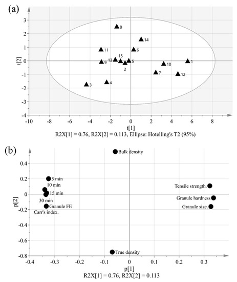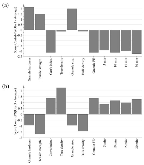 The purpose of PCA is to identify relationships between IQAs and CQAs in the experimental design. All 15 experimental design samples were included in the PCA. 11 variables were analyzed, including IQAs, such as granule size, granule hardness, Carr’s index, granule FE, bulk density, and true density, and CQAs, such as tensile strength and % dissolution at each time point. Two PC models were fitted to the variables. As shown in Figure 5, the first and second PCs (P[1] and P[2], respectively) explained 76.0% and 11.3% of the overall variability in the dataset, respectively. R2 is used as a measure of how well the variance of the data is explained in the model, and Q2 is used as a measure of how well the variance of the data is predicted in the model. The closer each value is to 1.0, the better the fit of the model. A score scatter plot in Figure 6a suggests there are no groups and no outliers outside the ellipse (95% confidence interval). In addition, the center point samples (run order 2, 5, and 15) were located near each center, indicating good reproducibility. Run order 1 and 3 were located further away from the other run orders. Score contribution plots of run order 1 and 3 are shown in Figure 7. It identifies why these differ more and which variables are the greatest contributing factors to the differences. The variables with larger positive and lesser negative values had significant effects on differentiating run order 1 and 3. The variables were shown to have completely opposite effects. This suggests that agitator speeds ranging 400–1200 rpm and massing time ranging 1–5 min in high-shear wet granulation have significant effects on IQAs and CQAs.
