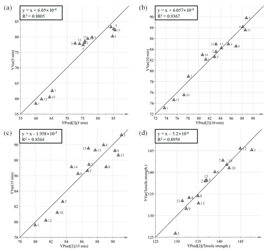 Predicted versus measured plots for tensile strengths (CQAs). (a) % dissolution at 5 min, (b) % dissolution at 10 min, (c) % dissolution at 15 min, and (d) tensile strength.