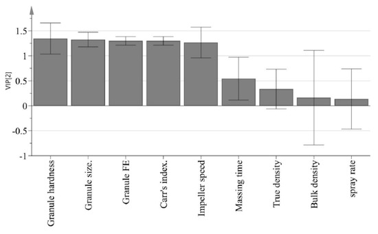 The purpose of PLS is to identify how all available process parameters and IQAs impact CQAs. PLS was used to define the relationship between X variables (process parameters and IQAs) and Y variables (CQAs). Figure 8 presents a predicted versus observed plot for CQAs from calibration models, which is presented by a solid black line. The R2 had % dissolution at 5 min, 10 min, and 15 min and tensile strength at 0.8805, 0.9367, 0.8364 and 0.8959, respectively. This might indicate a good model fit. As shown in Figure 9, the VIP (variable importance) presents the importance variables in the model both with respect to Y (CQAs) and X (process parameters and IQAs). VIP is normalized and the average squared VIP value is 1. Variables in the model with a VIP >1 are important to the model [1]. It appears that granule hardness, granule size, granule FE, Carr’s index, and agitator speed were important variables with respect to CQAs. Furthermore, massing time, true density, bulk density, and binding suspension addition rate did not have a significant effect on CQAs.