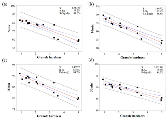 The fitted line plots of % dissolution ((a) 5 min, (b) 10 min, (c) 15 min, and (d) 30 min) versus granule hardness. The black dots, red line, blue dotted line, and black dotted line represent the experimental results, best fitted regression, 95% confidence intervals, and 95% prediction intervals, respectively.
