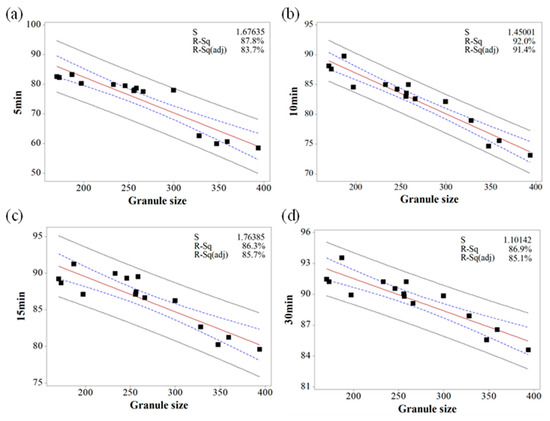 The fitted line plots of % dissolution ((a) 5 min, (b) 10 min, (c) 15 min, and (d) 30 min) versus granule size. The black dots, red line, blue dotted line, and black dotted line represent the experimental results, best fitted regression, 95% confidence intervals, and 95% prediction intervals, respectively.