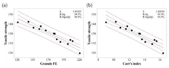 The fitted line plots of (a) tensile strength versus granule FE and (b) tensile strength versus Carr’s index. The black dots, red line, blue dotted line, and black dotted line represent the experimental results, best fitted regression, 95% confidence intervals, and 95% prediction intervals, respectively.