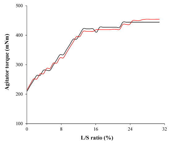 Agitator torque profiles at the lab scale (black line) and pilot scale (red line). The agitator powder consumption is plotted versus liquid/solid (L/S) ratio (%).
