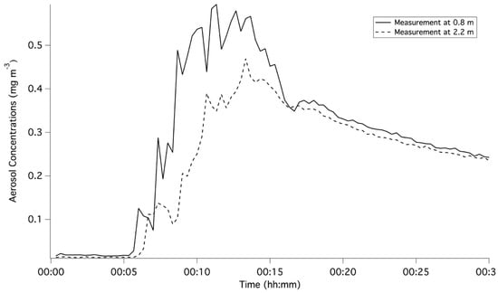 The laboratory room in which the study was conducted had dimensions L = 6.06 m, W = 2.70 m and H = 2.71 m. The air change rate was measured using the tracer gas decay method with CO2 as the tracer [], and a GrayWolf probe IQ-610 (GrayWolf Sensing Solutions; Shelton, CT, USA) was used for gas detection. The air change rate was calculated to be approximately 0.65 h−1.